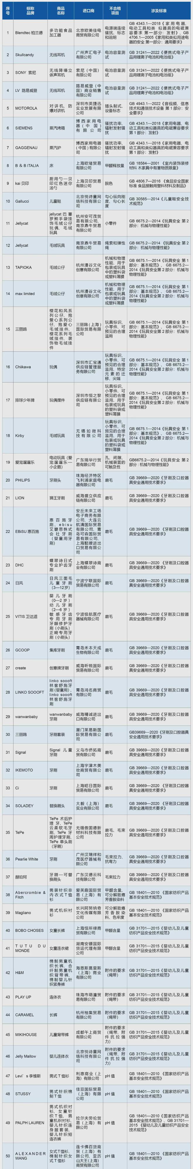 海关总署对2024年检出的进口“洋品牌”消费品质量安全不合格100个典型案例进行通报。不合格情况包括进口小家电电池容量测试、电器辐射发射项目不合格;进口玩具机械和物理性能、小零件项目不合格;进口服装甲醛含量、可分解致癌芳香胺染料超标;进口家具甲醛释放量超标;进口牙刷磨毛不合格等。