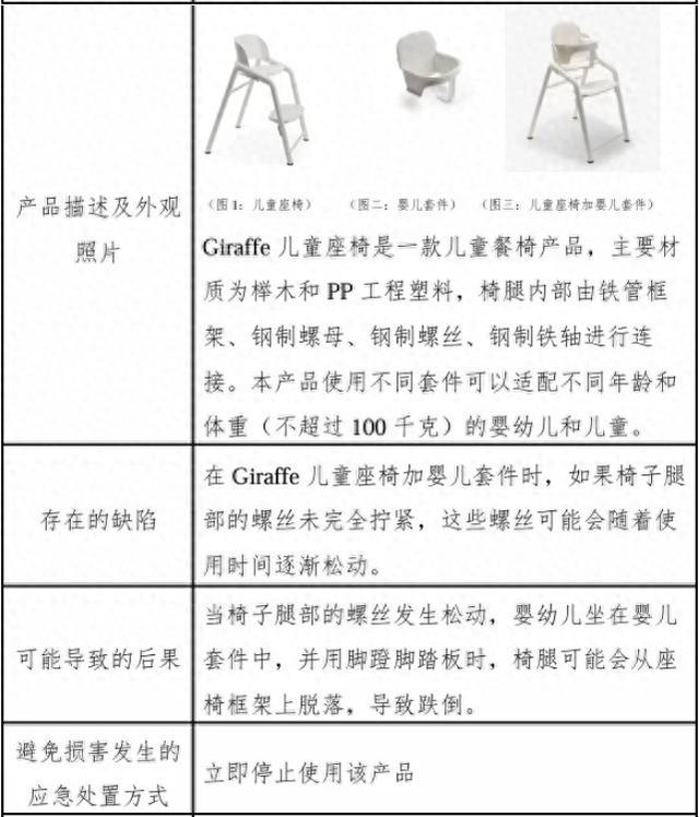 责任方表示,启动召回是因为椅子腿部螺丝未完全拧紧的话,可能随着使用逐渐松动,婴幼儿坐在婴儿套件中,并用脚蹬脚踏板时,椅腿可能从座椅框架上脱落,导致跌倒。