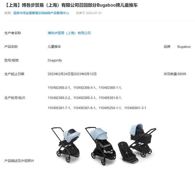 上海市市场监管局今天(5月15日)公布一则产品召回信息,博各步贸易(上海)有限公司自2025年5月15日至2025年8月14日召回2022年9月12日至2024年10月13日生产的部分Bugaboo牌Giraffe儿童座椅,共计7494件,涉及“2237”“2248”“2440”“2441”等51个生产批号/批次。