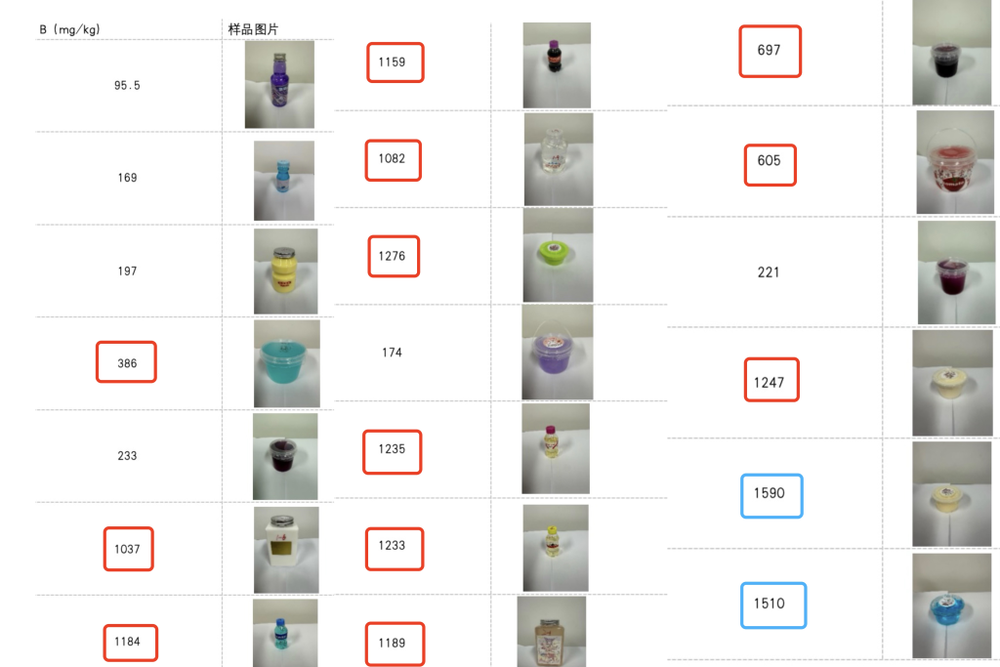 记者将前述“假水”的同店铺同款产品送检至上海纺织集团检测标准有限公司,检测结果显示,在送检的20款“假水”玩具中,有14款样品的硼迁移量超过了300mg/kg,其中,有两款样品的硼迁移量为1590mg/kg和1510mg/kg。