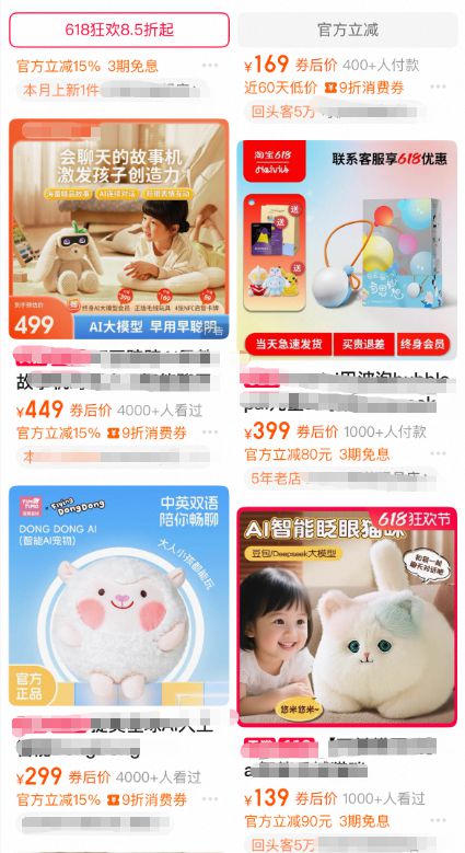 某电商平台,“AI玩具”相关商品已超1000款,头部产品月销破万,销量破千更是稀松平常,甚至有消费者一次性囤积数十件用于收藏。