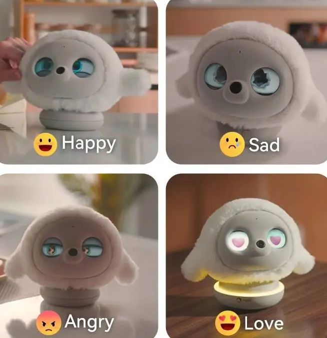 在 CES 2025 上,一款名为 Ropet 的AI陪伴机器人,依靠三个传感器收集到的数据,来识别人类的动作、语言、面部表情,其借助摄像头、传感器、AI 与眼球显示屏,可以在面对人类不同的行为或情绪作出相应的情绪反应。