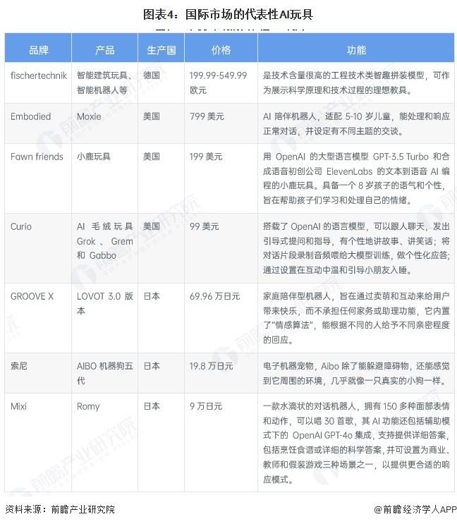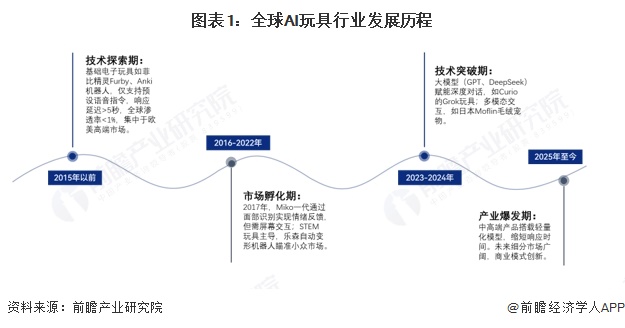全球 AI 玩具发展在2015年前处于技术探索期,基础电子玩具如菲比精灵、Anki机器人,功能较简单,响应延迟大,市场渗透率低且集中在欧美高端市场。2016-2022年是市场孵化期,2017年Miko一代虽能面部识别实现情绪反馈,但需屏幕交互。2023-2024年进入技术突破期,大模型赋能深度对话,多模态交互兴起,如 Curio的Grok玩具、日本Moflin毛绒宠物。目前全球AI玩具产业处于爆发期,中高端产品搭载轻量化模型,缩短响应时间,未来细分市场广阔,商业模式创新不断涌现。