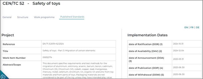 2024年10月31日,欧洲标准化委员会(CEN)批准了欧洲玩具安全标准修订版EN 71-3:2019+A2:2024《玩具安全 - 第3部分:特定元素的迁移》,并于2024年12月4日在CEN官网正式发布该标准的官方版本。