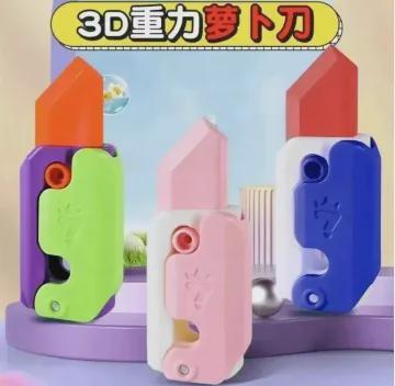 其实这种萝卜刀是一款塑料仿刀玩具,由3D打印塑料制成,因借助自身重力实现刀体滑动,所以也叫“重力萝卜刀”。