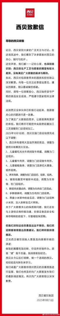 9月15日道歉信里,西贝给了“2025年10月1日前调整完成”的时间表,话说得不软