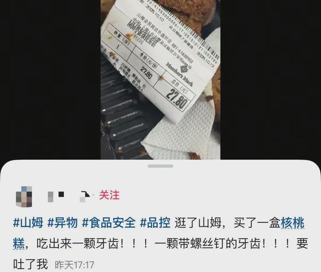 10月14日,一位上海消费者发布的“山姆枣泥核桃蛋糕中吃出金属异物”的短视频在社交平台迅速发酵。视频画面显示,从山姆外高桥店购买的“MM枣泥核桃蛋糕”剖面里,存在一枚形似牙齿、一端带有金属螺纹的异物。