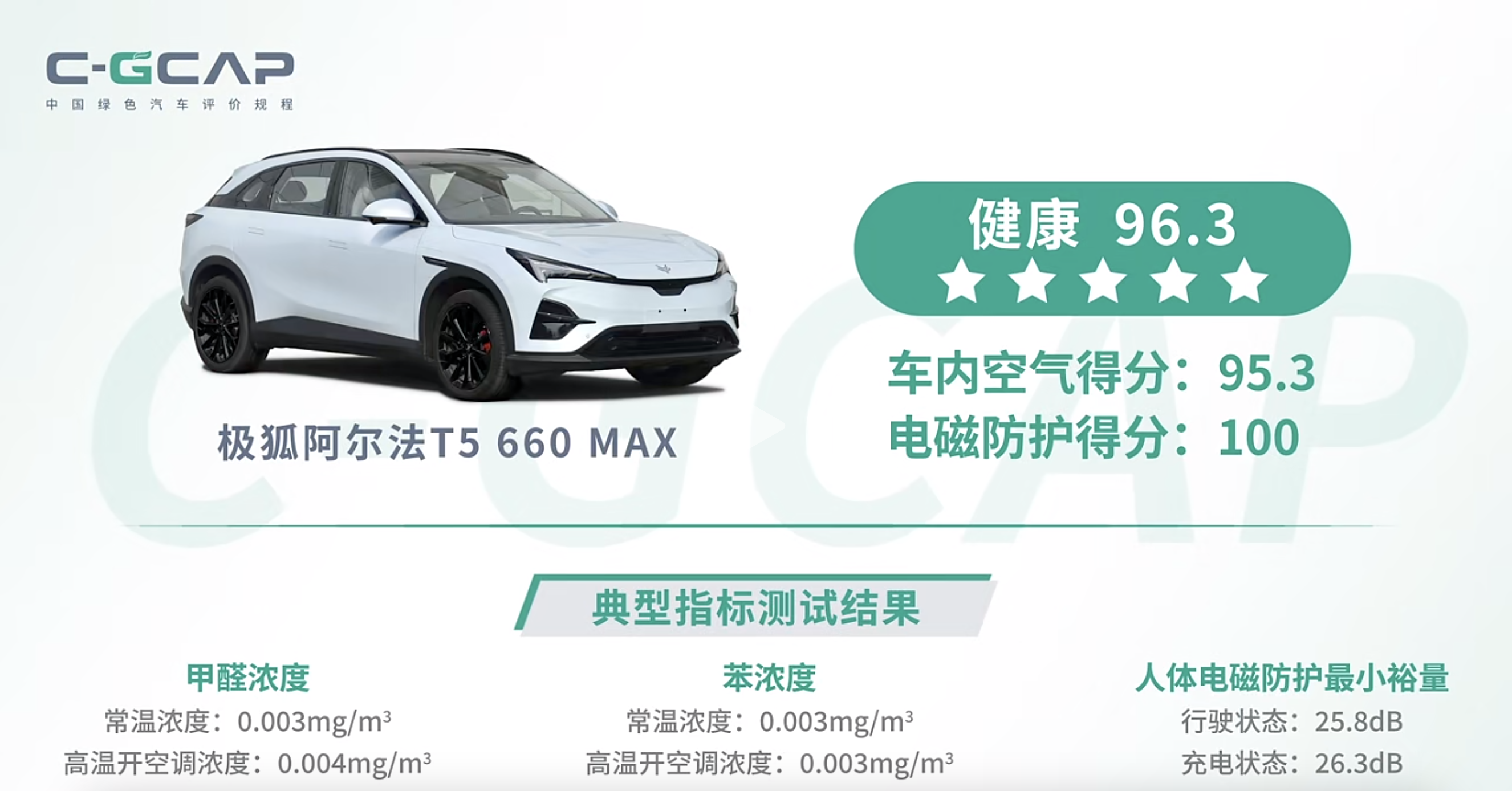 从此次评测细分享结果来看,阿尔法T5健康板块96.3的历史最高分,源于有害气体、车内气味和电磁防护等细分领域的优异表现,其中,阿尔法T5在有害气体浓度方面获得99.7分,超过已测车型均分5.1分,成为该项测试以来最高得分。车内气味获得88.8分,超过已测车型均分6.4分;在高温暴晒且不开空调的情况下,甲醛浓度和苯浓度仅为0.008mg/m³和0.004mg/m³,已经达到儿童房的标准;在电磁防护方面,阿尔法T5在行驶状态和充电状态中都获得了100分,分别超过平均分10.6分和7.3分,遥遥领先其他车型。