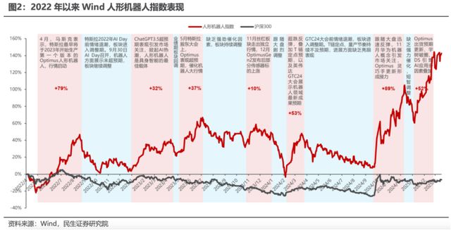 而在资本市场,2022年以来,人形机器人板块已迎来多轮行情。2025年1月初,马斯克更新Optimus出货预期,预计2027年出货量达50万至100万台;宇树科技凭借B2-W四足机器狗的亮眼表现、人形机器人H1的春晚表演强势破圈,带动国产机器人关注度提升。
