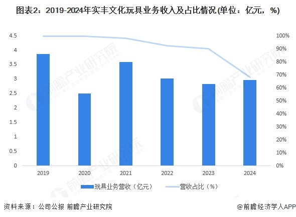 玩具业务一直是实丰文化的主要收入来源,2019-2023年期间营收占比均在90%以上。2024年公司玩具业务收入2.97亿元,占总营收的67.98%。其中,玩具贸易1.12亿元,占比44.62%;婴幼玩具0.80亿元,占比31.73%;电动遥控玩具0.53亿元,占比21.11%。