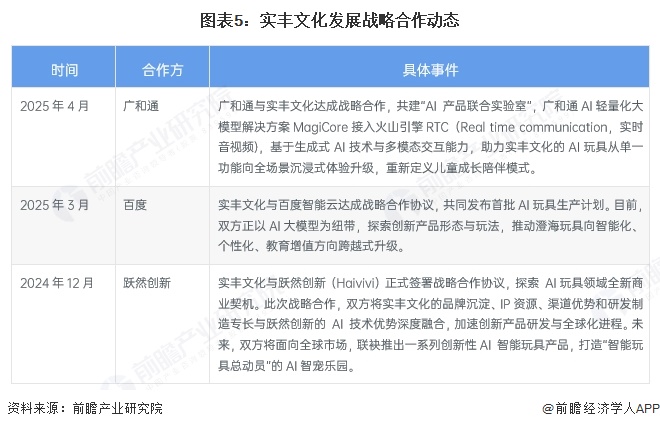 2024年12月,公司与跃然创新签署协议,融合双方优势探索AI玩具商业契机,计划推出智能玩具产品;2025年3月与百度智能云达成合作,发布首批AI玩具生产计划,借助AI大模型推动玩具向智能化等方向升级;2025年4月又与广和通合作共建“AI 产品联合实验室”,接入相关技术助力AI玩具体验升级。接连不断的合作显示出实丰文化在AI玩具领域不断推进创新与发展的战略布局。