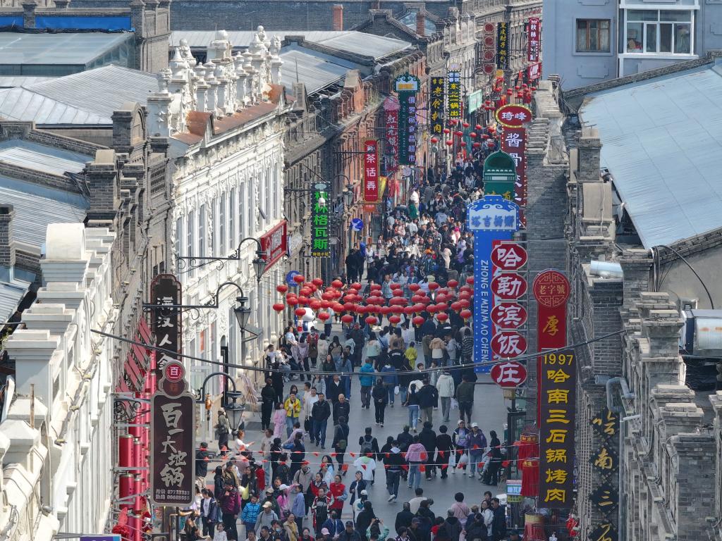 5月1日,人们在黑龙江省哈尔滨市道外区中华巴洛克历史文化街区游览(无人机照片)。新华社发(张树摄)